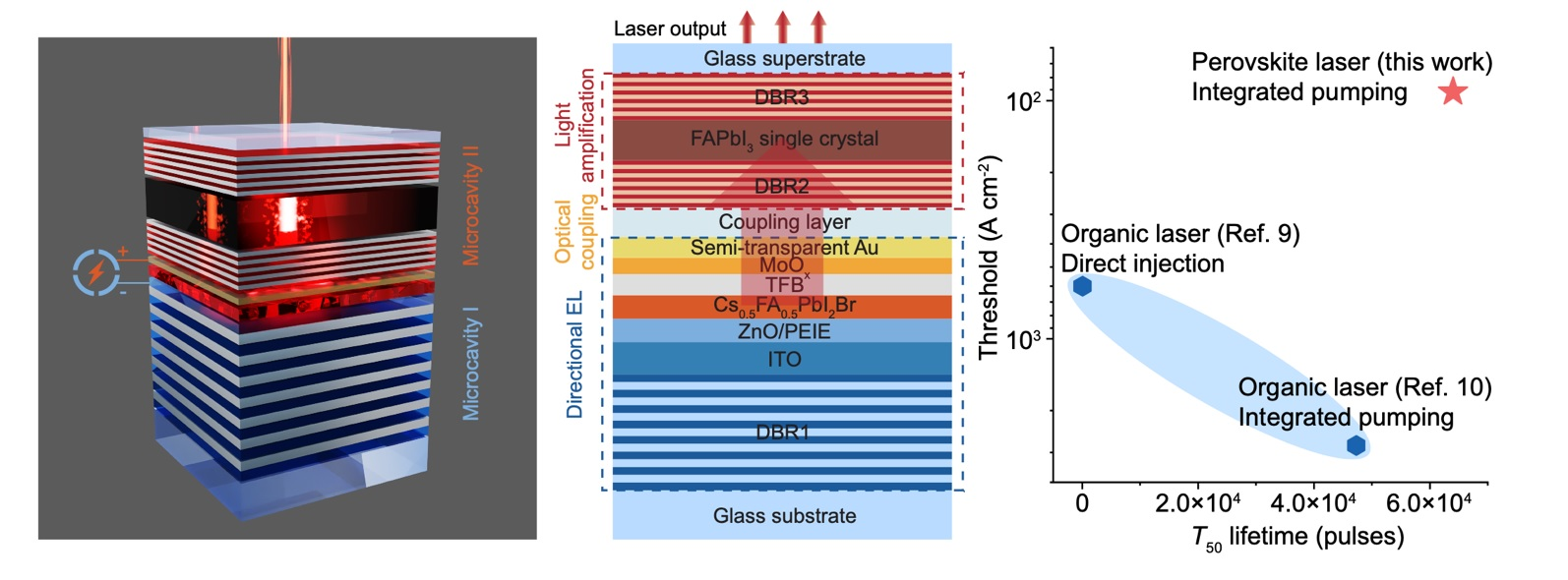 Laser a semiconduttoresono importanti fonti di luce nell'informatica. I semiconduttori di perovskite sono una nuova classe di materiali laser con bassi costi operativi e facile integrazione in piattaforme optoelettroniche basate sul silicio. I loro spettri di emissione regolabili consentono ai laser guidati otticamente di raggiungere la soglia laser più bassa possibile, aprendo significative opportunità tecnologiche. L'energia esterna richiesta per azionare i laser viene generalmente fornita in due forme: energia elettrica ed energia ottica. Tuttavia, il controllo ottico richiede in genere sorgenti luminose esterne di alta qualità, limitando il numero di dispositivi utilizzabili. Lo sviluppo di laser a perovskite azionati elettricamente è una sfida fondamentale nell'optoelettronica della perovskite.