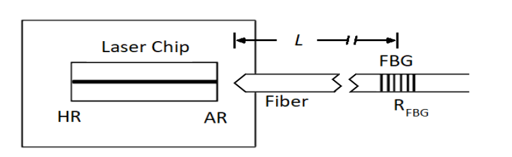 Costruire un laser a cavità esterna utilizzando un reticolo in fibra di Bragg (FBG) è una soluzione economica per migliorare le prestazioni dei laser a basso costo. Come mostrato in Figura 1, l'FBG è inscritto nel codino della fibra, solitamente vicino al chip emettitore, formando una cavità laser esterna.